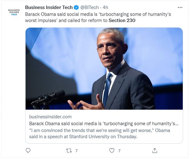 Just yesterday, Obama gave a “compelling” speech before the Stanford Cyber Policy Center calling for MORE censorship, and Section 230 reform!