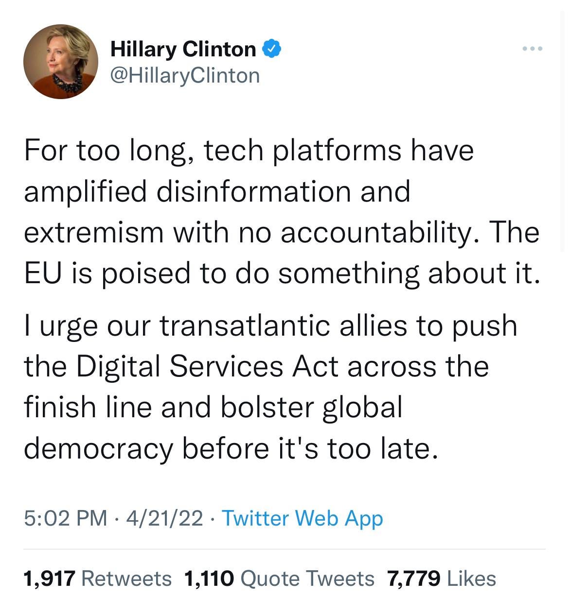 The DSA is a wet dream package that will allow the state to regulate speech in Orwellian fashion via Big Tech platforms throughout the European Union. Globalists like Hillary and Obama would LOVE to have the same thing here, and that is EXACTLY what Obama is attempting to suggest that Congress enact in the states!